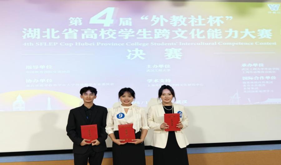 本网消息 2025年10月18日,第四届“外教社杯”湖北省高校学生跨文化能力大赛决赛在武汉工程大学落下帷幕。来自我校英国正版365首页、新材料与绿色化工学院、经济与管理学院的方彤、吴郦雯、何运三位同学组成的参赛团队凭借出色的跨文化交际能力与扎实的英语应用水平,勇夺省级一等奖。这是我校首次在该项赛事中晋级决赛并斩获最高奖项,标志着我校在跨文化人才培养方面取得重要突破。