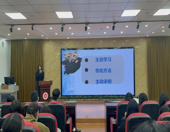 国家励志奖学金获得者吴涵冰以“不负韶华,筑梦远航”为主题,生动讲述了自身成长与蜕变,并在感恩之心引领下传播坚韧力量。万澜聚焦自身成长经历,深情讲述了一段坚强不屈的人生故事。从她的分享中,我们深切感受到诚信与感恩的力量,现场同学无不深受触动。