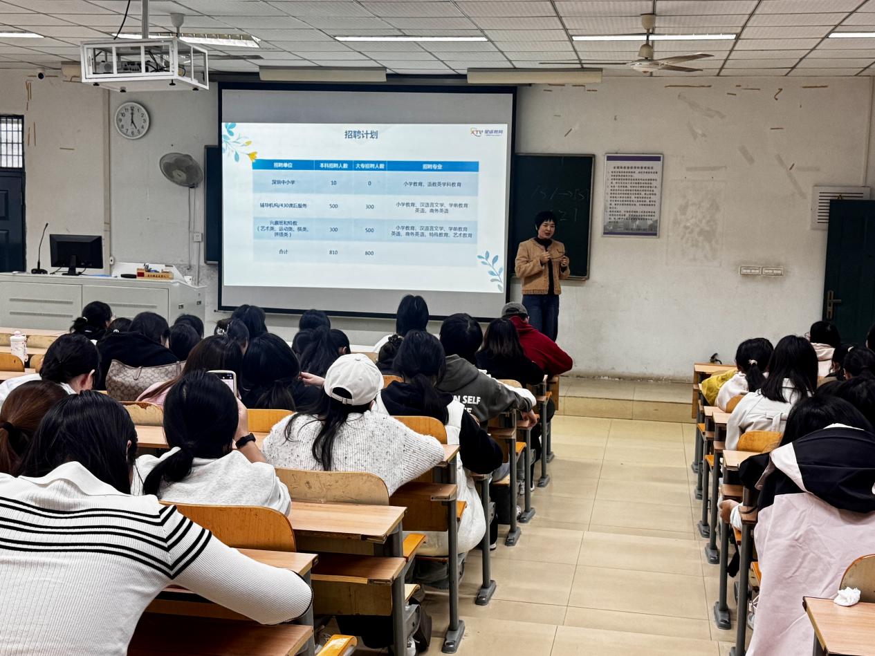 与此同时,深圳星途教育有限公司为英语专业(教育方向)学子举办的专场宣讲会则充满了浓厚的“教育情怀”。公司代表罗莎女士通过PPT演示、案例分享等多种形式,全方位展现了企业实力与发展前景,并详细介绍了针对应届毕业生的系统化培训体系与清晰的晋升通道,为有志于投身教育事业的同学们描绘了清晰的职业蓝图。