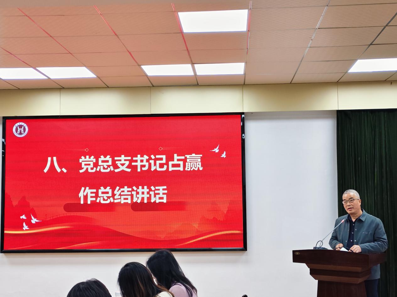 占赢在总结讲话中,向全体教职工过去一年的辛勤付出表示衷心感谢。他指出,2025年作为“十四五”收官之年,学院在课程建设、教学竞赛、人才培养、科研成果、校企合作及毕业生就业等方面成效显著。同时,学院也面临英语专业转型瓶颈与大学英语教学双重挑战。他强调,学院要以需求为导向深化改革,坚持“公外树亮点,专业创特色”;全院教职工要坚守育人初心、聚焦科研攻坚、强化协同治理、精进自我提升,团结一心、锐意进取,共同推动学院在教育强国建设征程中实现新跨越、谱写新篇章。