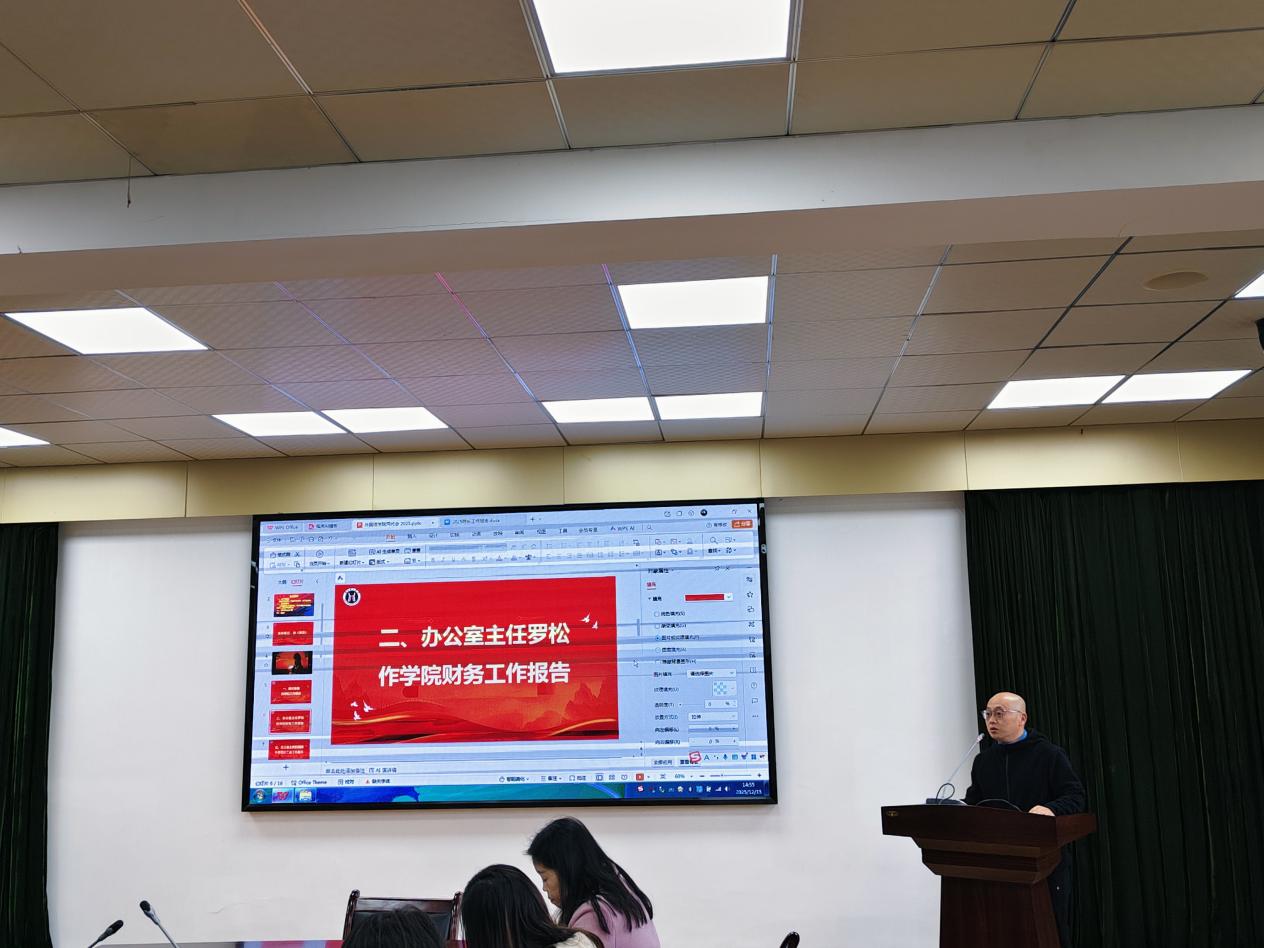 办公室主任罗松作学院财务工作报告,汇报了学院2025年经费使用情况和预算执行情况。分工会主席彭腊腊作学院工会工作报告,全面总结了分工会在强化思想引领、提升服务保障、助力教师成长、规范自身建设等方面的工作成效,通报了学院工作提案征集及立案情况,并明确了2026年工作重点。